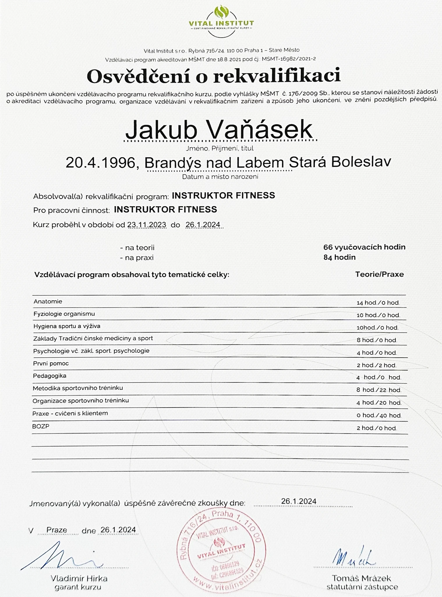 Získané znalosti - zkušenosti a to i ty životní jsem stvrdil studiem a kurzy s akreditací. Jsem certifikovaný trenér fitness, trenér kulturistiky, instruktor kondičního posilování a osobní trenér kondičního posilování.